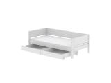 White MDF Einzelbett mit 2 Schubladen und Pfosten aus Birke. Pfosten: weiss - Bett:weiss