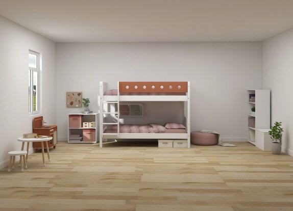 White MDF Etagenbett mit farbiger Absturzsicherung und Pfosten aus Birke, weiss/weiss/weiss.