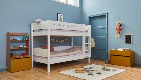 White MDF Etagenbett mit farbiger Absturzsicherung und Pfosten aus Birke, weiss/weiss/weiss.