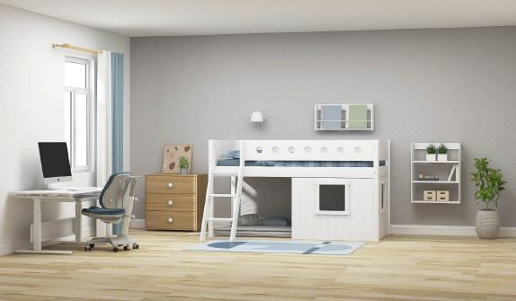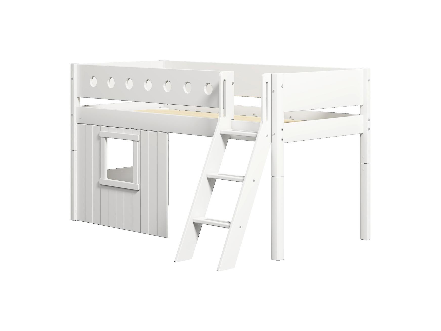 Absturzsicherung und Hausfronten aus MDF. Bett,Fensterrahmen und Pfosten aus Kiefernholz, alles weiss lackiert.