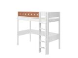 White MDF Hochbett mit senkrechter Leiter und farbiger Absturzsicherung.